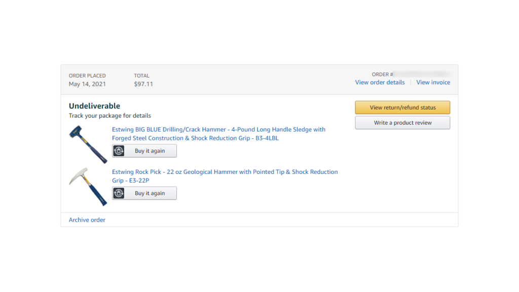鉱物採集用の「Estwing E3-22P ロックピックハンマー」と「Estwing エスティング クラックハンマー B3-4LBL」を5月14日に注文。大体、2週間もすれば届くはずなのに5月最終日になっても全然届かない、amazon.comにログインしてステータスを調べると「Undeliverable」(配達不能)の文字が。